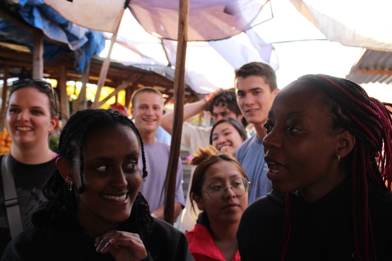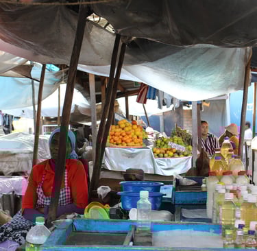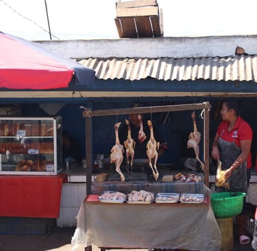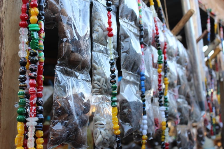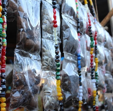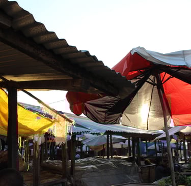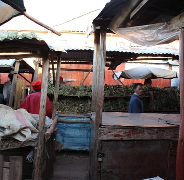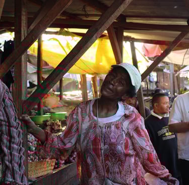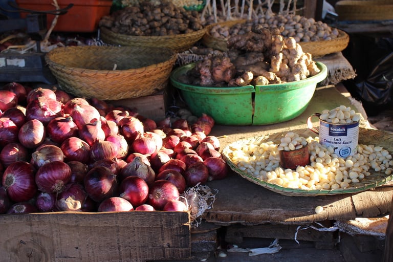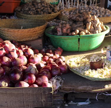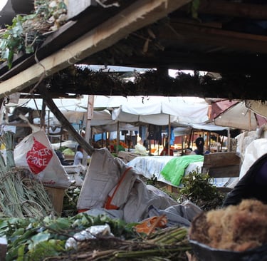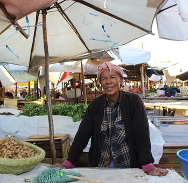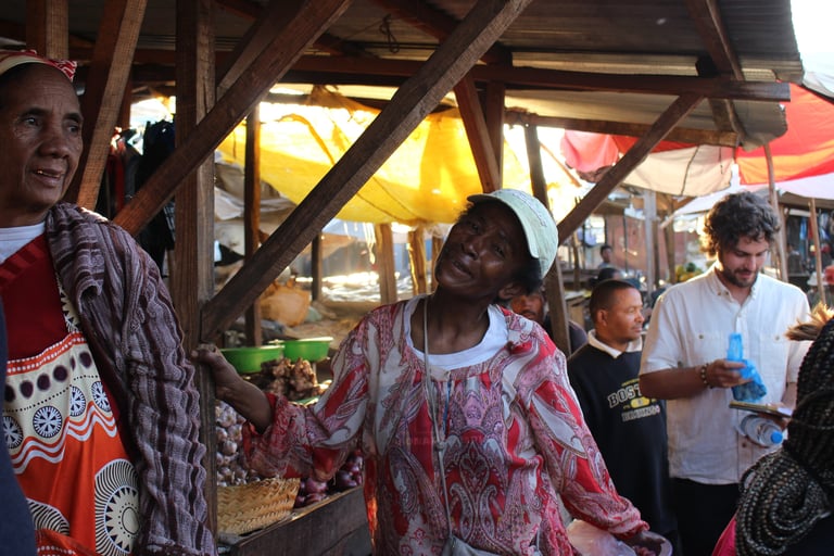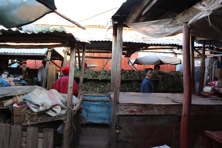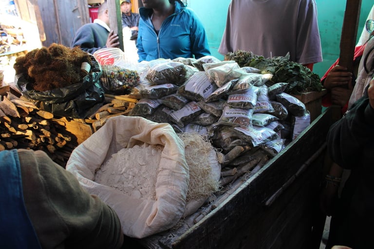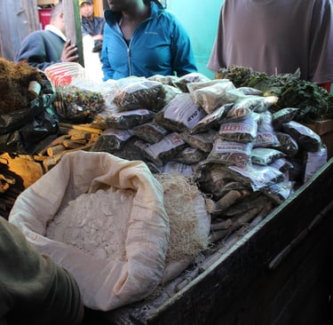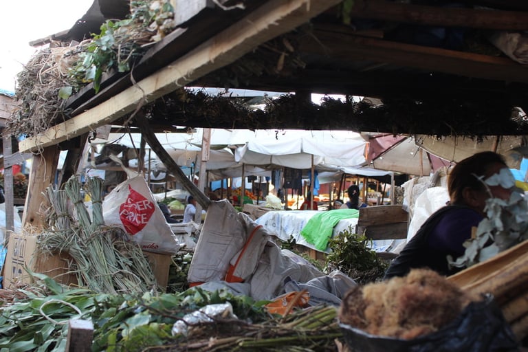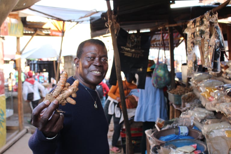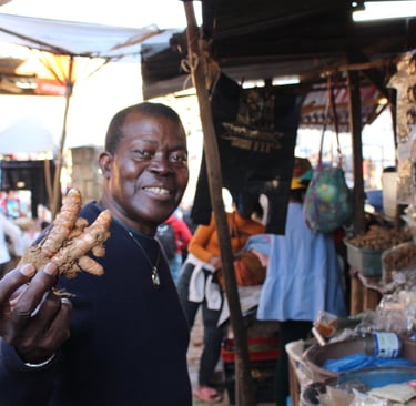 Featuring traditional medicine market stands and sellers, Nat holding some turmeric