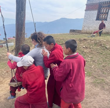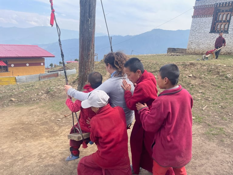 We finished our exploration, packed our tent, and began the descent. The trek passes through Phajoding monastery, which is nestled high up at around 12,500 feet. We stopped outside one of the buildings to fill up our waters and take a break. There were some young monks roaming around and curiously watching us. There were around six of them, mostly 9 and 10 years old with the oldest of them being 13. We offered them snacks, including Cheetos. They were incredibly grateful, and eventually found the courage to ask us where we were from. The rest is history… they welcomed us inside and served us tea, and we gave them all the cookies and snacks which we had to offer. They asked us if we wanted to go with them down the mountain a bit to play. Our small entourage bounded down the mountain with much giggling and glee. They were very happy to ask us questions ("do you know how to jump?", "are you married?") and we all got to know each other quite well. For the next three hours, we played with a tennis ball, swung on swings, skipped rocks, and sailed boats of sticks and leaves. They were very excited to take us into the temple as well and explain the various deities to us.